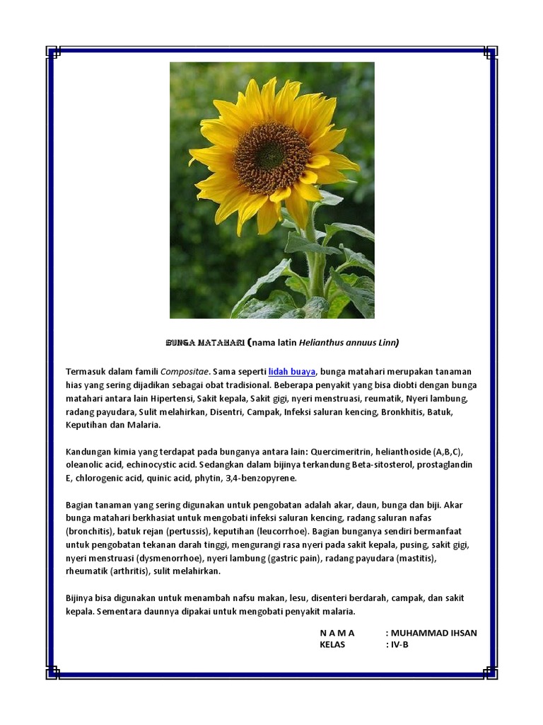 Khasiat Bunga Matahari Yang Perlu Anda Ketahui Media Pendidikan from 4.bp.blogspot.com Tumbuhan berbunga nyatanya juga masuk ke dalam salah satu jenis tanaman obat. Di sisi lain, tanaman ini mempunyai khasiat sebagai salah satu tanaman obat yang banyak manfaat. 1)infeksi saluran kencing, kesulitan buang air kecil, obat batu ginjal , batu saluran kemih / kencing batu , dan air kemih berdarah rebus 30—40 g akar dan batang bunga matahari segar dengan 4 gelas air hingga tersisa 2 gelas. Jenis bunga untuk obat yang pertama adalah bunga matahari yang terkenal mengandung quercimeritrin, asam echinocystat, asam oleanolat, prostaglandin e, helianthoside, asam chlorogenic, lemak dan asam quinat. Contoh gambar mozaik bunga matahari. Manfaat biji bunga matahari untuk kecantikan kulit sumber gambar: Biji bunga matahari sangat kaya akan magnesium, memang kalsium diperlukan untuk tulang kuat, tapi magnesium juga sangat berperan dalam hal ini. Manfaat bunga matahari untuk kesehatan: